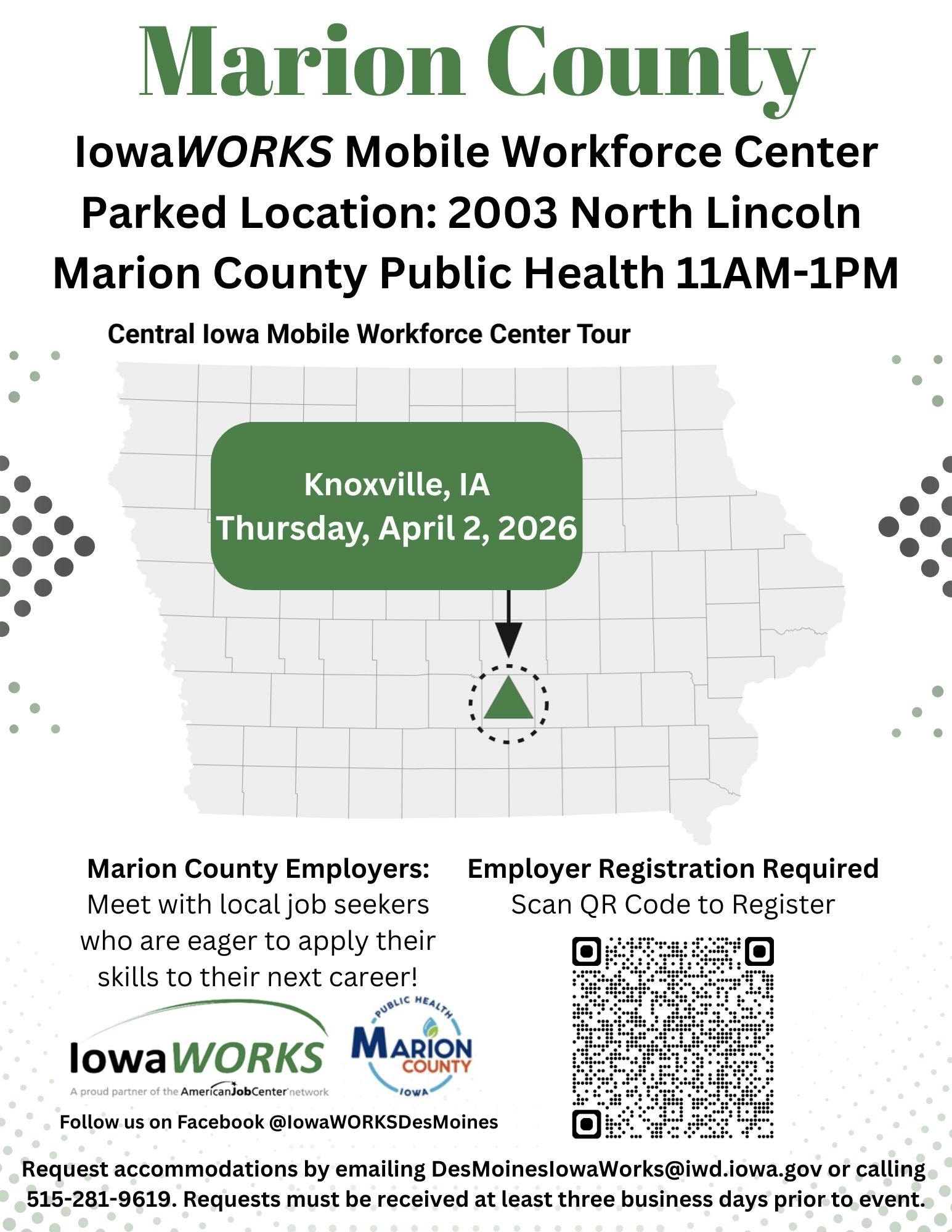 On Thursday April 2nd, 2026 IowaWorks will be holding a Mobile Workforce Center at Marion County Public Health from 11am to 1pm. For more information see the flyers below for Employer's and Employment Seekers.